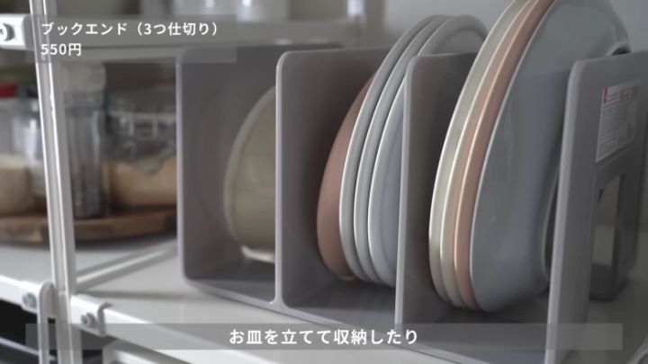 キッチンでは、お皿を立てて収納する際に役立ちます♪上に重ねると下のお皿を取りにくくなりますが、立てることで解決しますね。