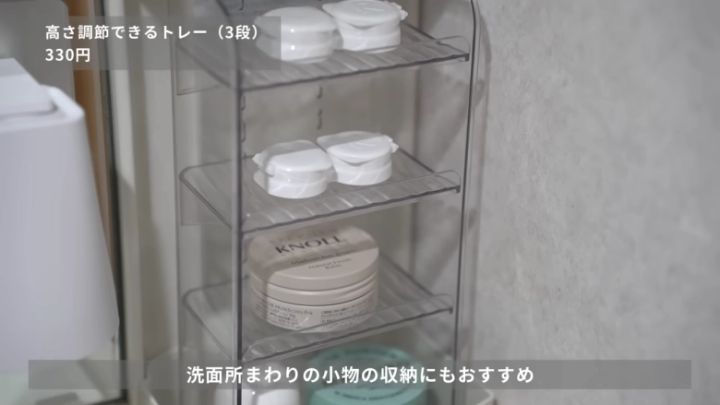 また、洗面所での小物収納にもピッタリとのこと。コンタクトケースやハンドクリームなど、バラバラになりがちな小物の収納に活用できます。