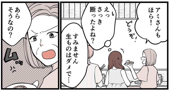 <義母、妊婦に生もの強要>看板メニューの「鳥刺し」食べないのは失礼!?圧が怖い…【まんが】