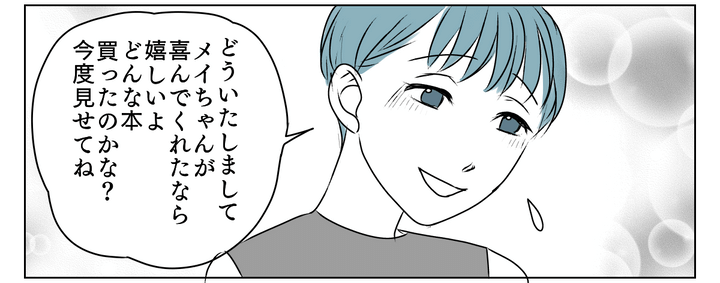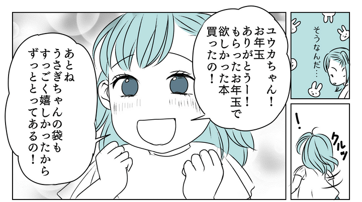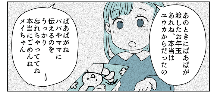 メイはそう言われて、「そうなんだ」とつぶやくと、ユウカさんの方に向き直りました。そしてお年玉のお礼と、そのお年玉で欲しかった本を買ったこと、ポチ袋をとっておいていることを嬉しそうに話しました。