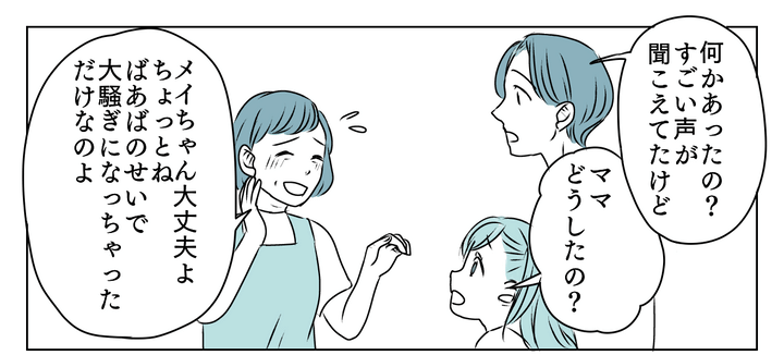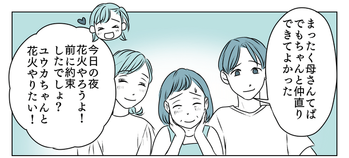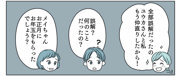 私はヒトミ。夫タケアキ、小1の娘メイと3人暮らしで、今は遠方の義実家に帰省中です。義母に詰め寄ると、義母は「やだ! 私、ユウカからのお年玉だって言ってなかった!?」と大騒ぎ。お年玉の件は、義母が伝え忘れたという「うっかり」が原因だと判明しました。義姉のユウカさんは私からお礼がなかったことに腹を立てていたようですが、そのあいだずっと、私はそのお年玉を義母からのものだと信じ続けていたのです。それでは話が食い違うのも当然。それぞれの誤解が解けて、私たちは謝罪合戦に。張り詰めていた空気が和らぎ、3人で笑い合います。