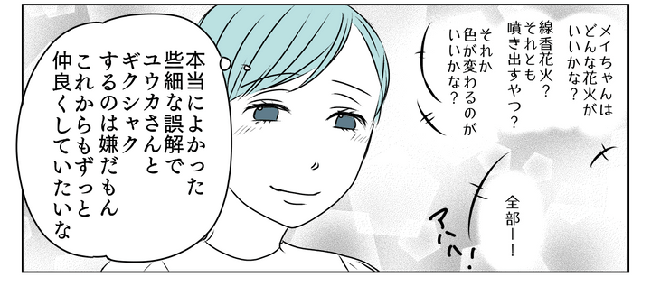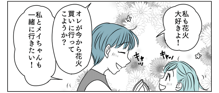 今夜は、みんなで仲良く花火をするようです。メイと夫、そしてユウカさんで花火の買い出しに向かいました。