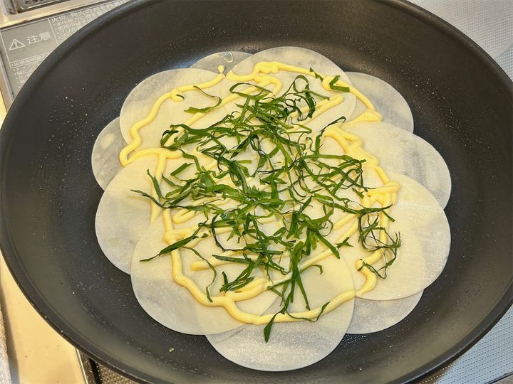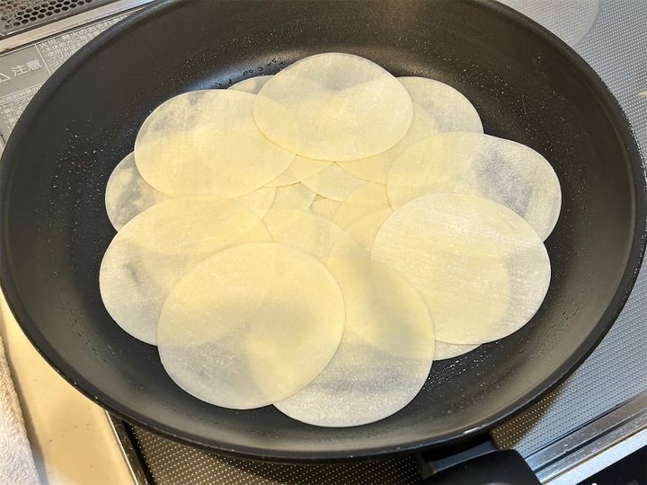 3. フライパンにオリーブオイルを薄く引き、ぎょうざの皮を並べます。