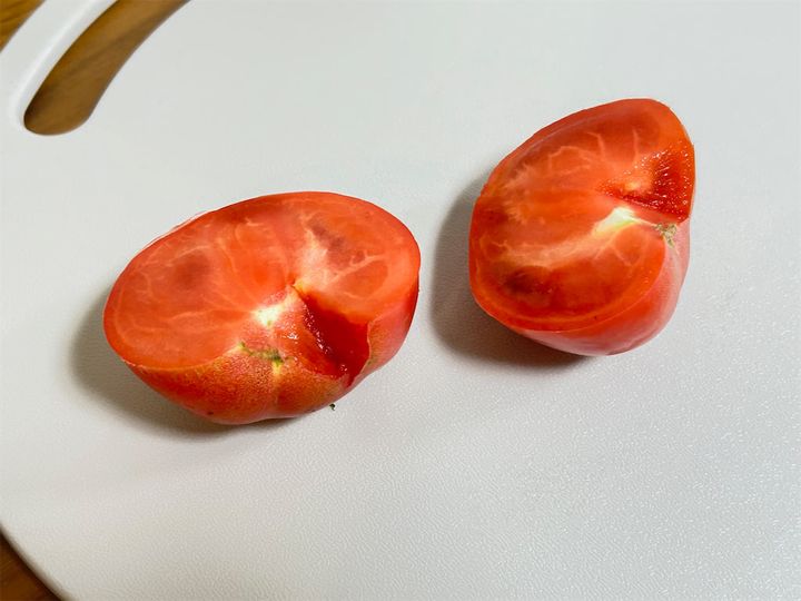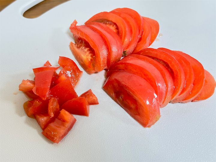 このとき、トマトの両端部分は下の画像のように細かく角切りにします。