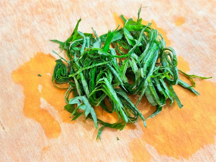 青じそは軸を切って、手前からクルクルと巻いて千切りにします。
