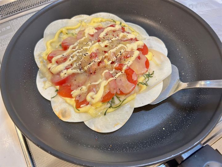 3. トマトをたっぷり食べたいなら「餃子の皮」にのせて焼こう!ドサッとチーズかけて2度焼きすれば大優勝!
