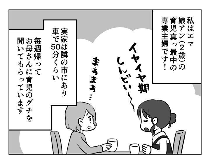エマさんは2歳の娘・アンちゃんを育てるアラサーの専業主婦。実家が大好きで、お母さんとも仲がいいエマさんは、結婚した後も頻繁に実家へ行っています。