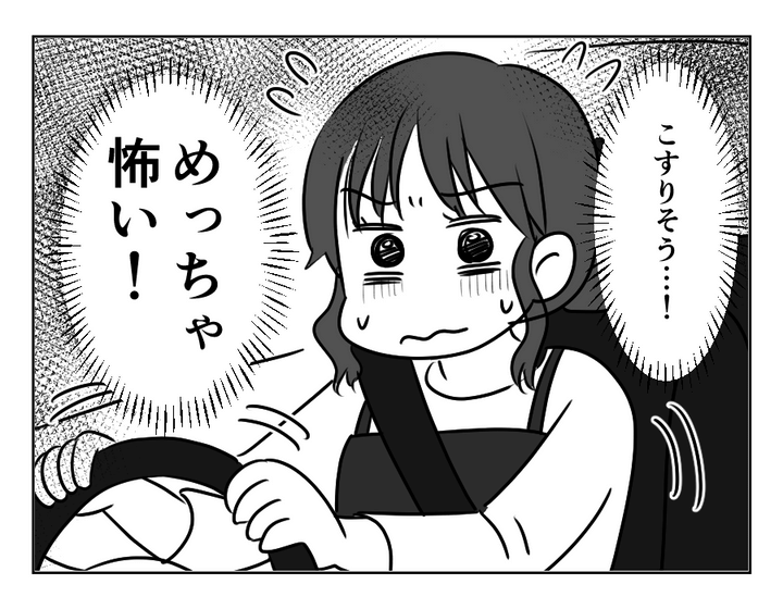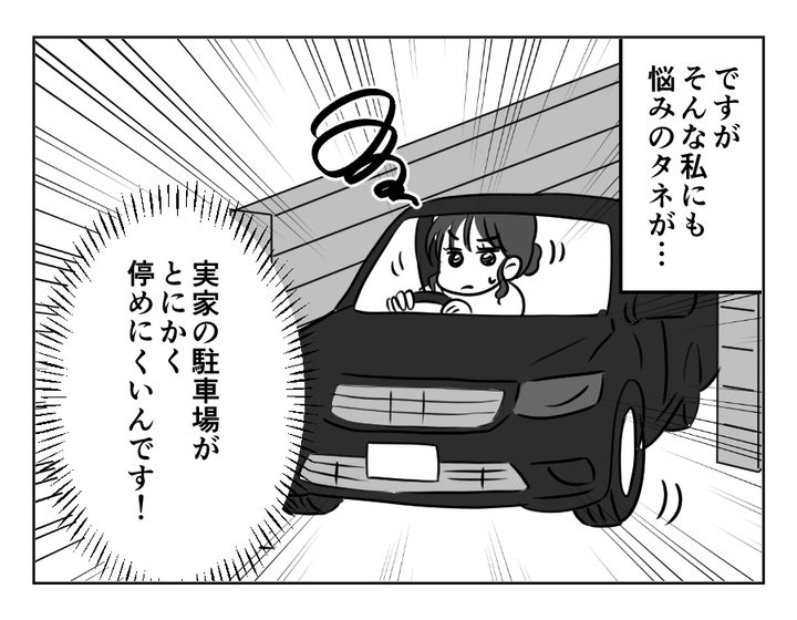 エマさんの車は旦那さんと兼用。最近車を買い替え、旦那さんの好みで車が大きなサイズになり、以前から苦手だった駐車がさらに難しくなったそうです。慣れない車、さらに新車で、「絶対にこすれない!」というプレッシャーからエマさんは毎回ヒヤヒヤしながら駐車している様子。最近では実家に向かおうとすると、あの狭い駐車場がふっと頭に浮かび、ブルーな気持ちになってしまうエマさんなのでした。