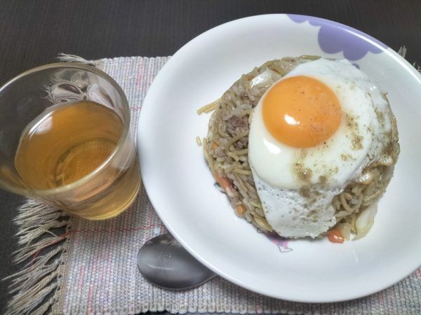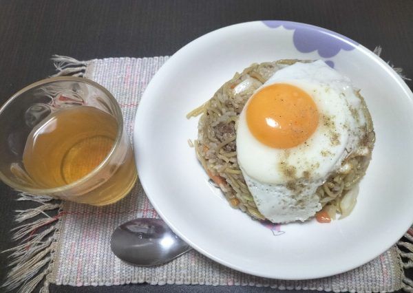 そばめしの上に目玉焼きを乗せて完成。 お店風に形も整えてみました。 とろっとした半熟卵の目玉焼きがそばめしとよく合います。