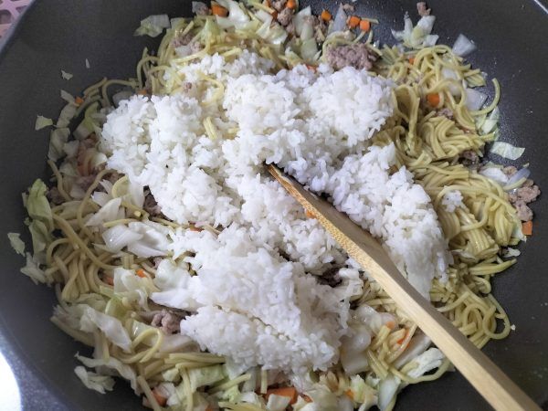 最後にご飯を入れてよく混ぜ炒めます。 混ざったら、塩こしょう少々、調味料を入れます。 調味料などをよく混ぜたらそばめしは完成。