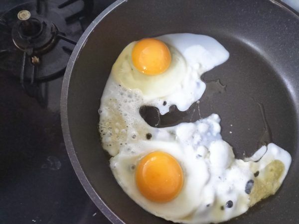 フライパンに少々の油をひき、目玉焼きを作ります。 塩こしょうを少々かける。