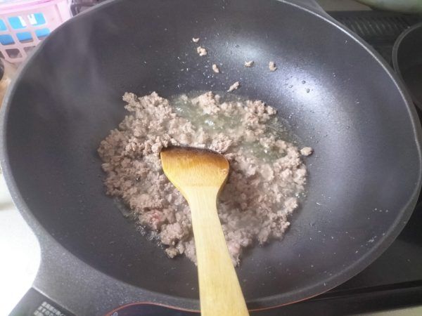 熱したフライパンに豚のひき肉を入れ色が変わるまで炒めます。 豚のひき肉から脂がでるので油は使用しません。 ひき肉が炒まったら、野菜、麺の順番に入れて混ぜながら炒めます。