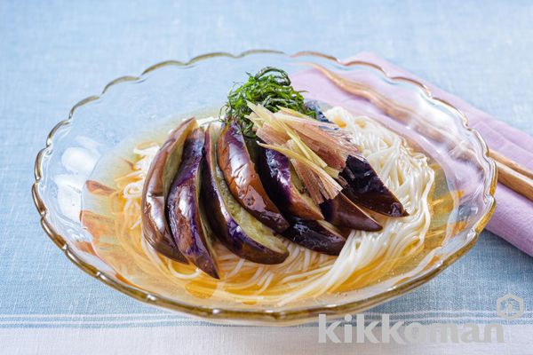 蒸しなすを冷たいそうめんにのせてつくる絶品そうめん。蒸しなすは電子レンジで2分加熱するだけで手軽にできます。だしのうま味が濃厚な「キッコーマン 濃いだし 本つゆ」と水が1:4のつゆに、薬味を絡めて食べて。