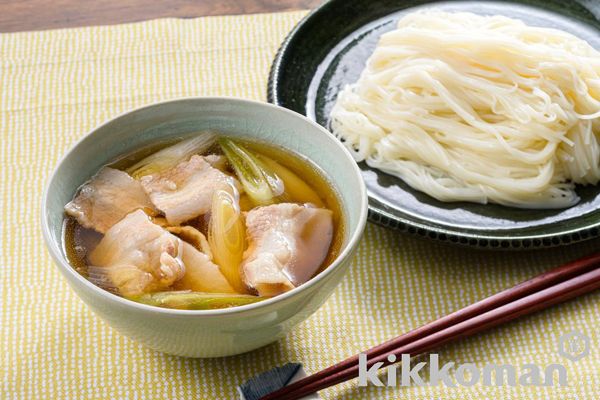 冷房で体が冷えがちな時には、温かいつけつゆで食べるそうめんもおすすめ!豚バラのうま味とねぎの甘みがつまったつゆがそうめんによく絡みます。