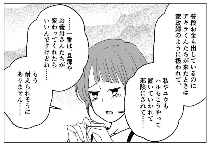 義姉の剣幕には少し驚きましたが、私と子どもたちの気持ちを汲み取ってくれて、嬉しかったです。私は、家政婦のように扱われることや子どもたちが邪険にされることに耐えられない……と正直に話しました。