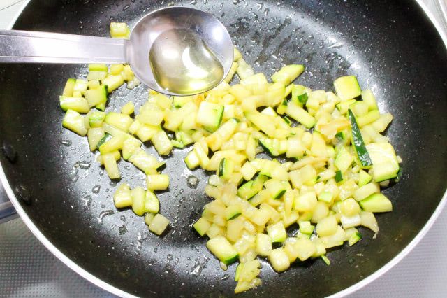 6. 5のフライパンに、2で粗みじん切りにしたズッキーニを入れ、中火で炒めます。塩で味を調えたら火を止め、蜂蜜を加えて混ぜ合わせます。