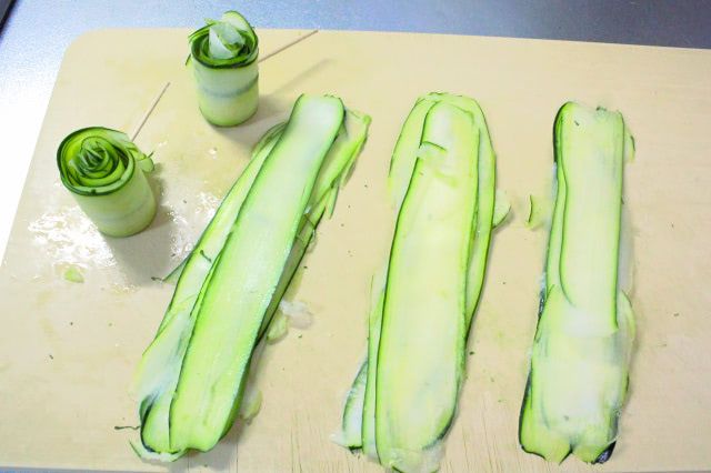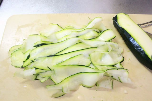 1. ズッキーニのへたを切り落として、ピーラーで縦に薄くスライスします。