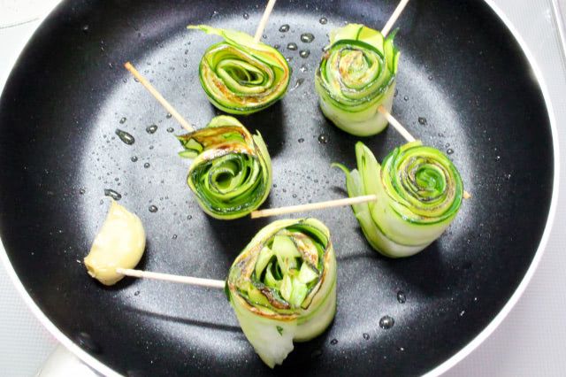 2. 1を適当な太さに巻いて、爪楊枝で留めます。残ったズッキーニを粗みじん切りにし、にんにくは皮ごと潰しておきます。