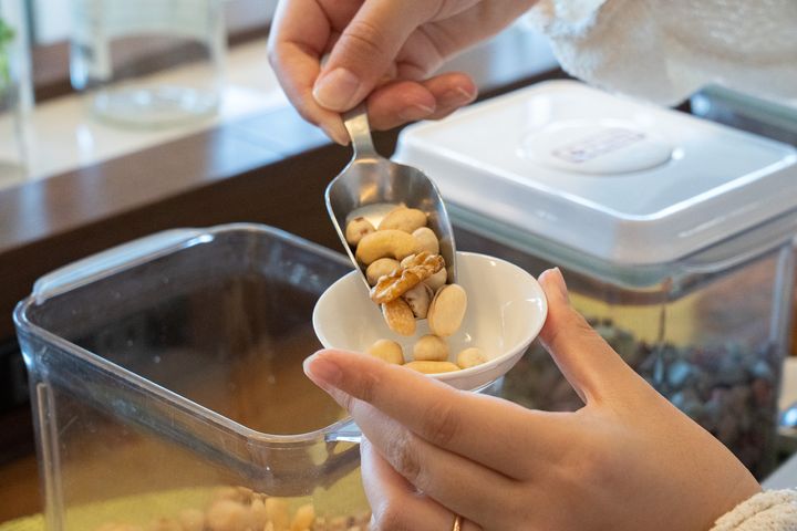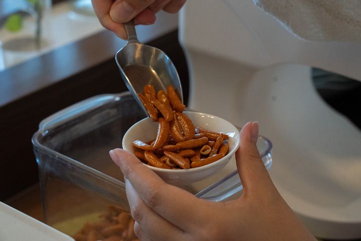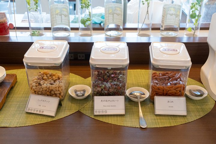 ラウンジ内では、おつまみ3種類とフリードリンクのサービスが提供されています。おつまみは、ミックスナッツ、あられ、月の石チョコレートの3種類。どれも手軽に楽しめるスナックで、旅の合間に“ちょっとだけ何かつまみたい”というときにぴったりでした。