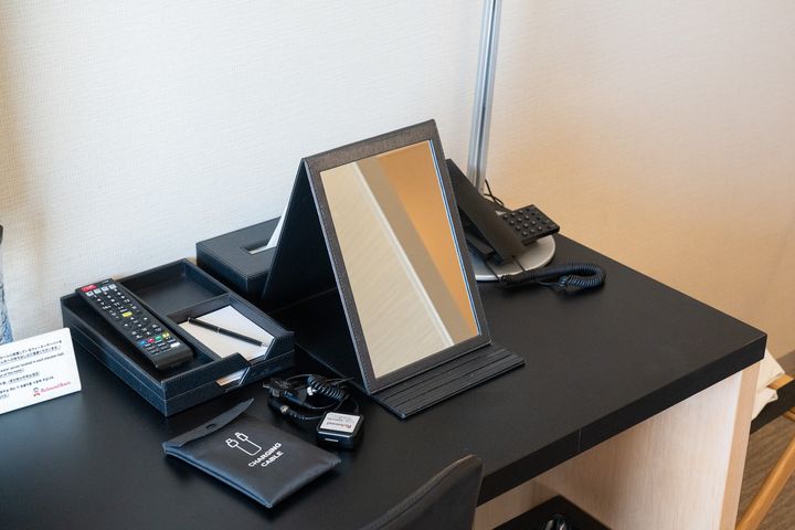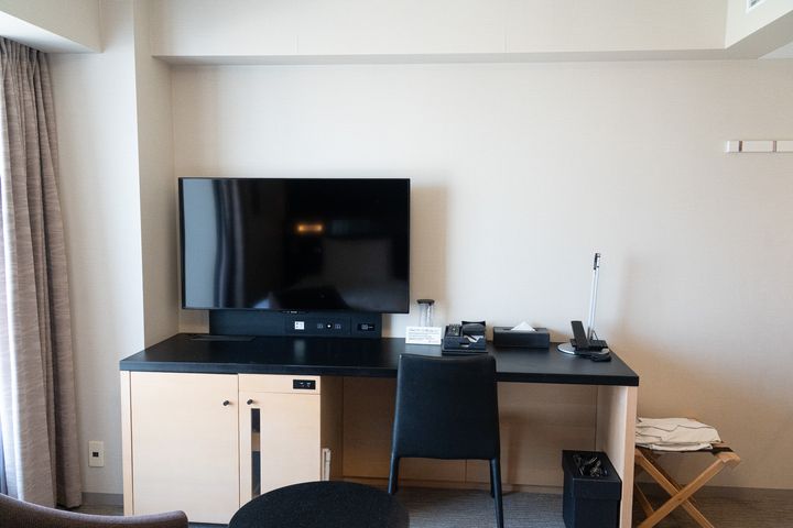 また、壁際には幅広のワークデスクも完備されていて、PC作業や軽い書き物などにも十分なスペースがあります。観光だけでなく、ワーケーションにもぴったりな環境だと感じました。