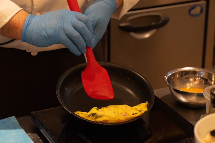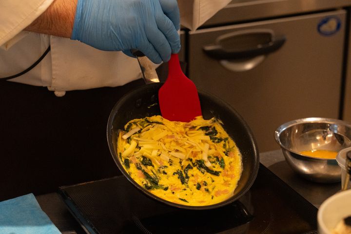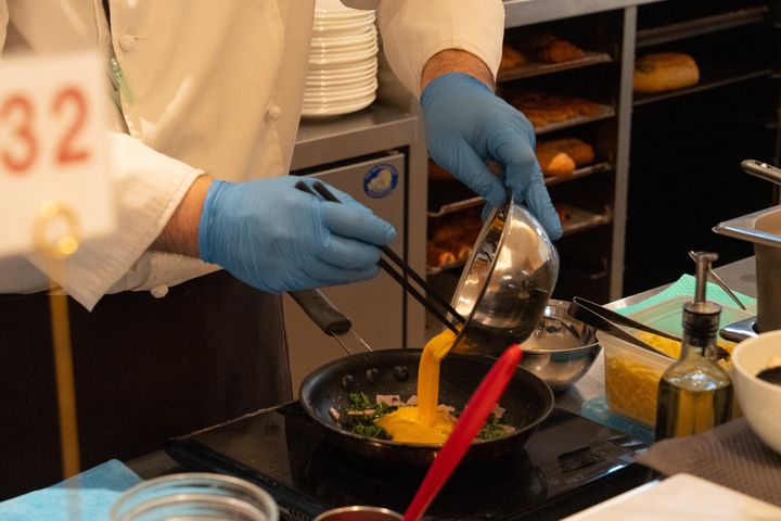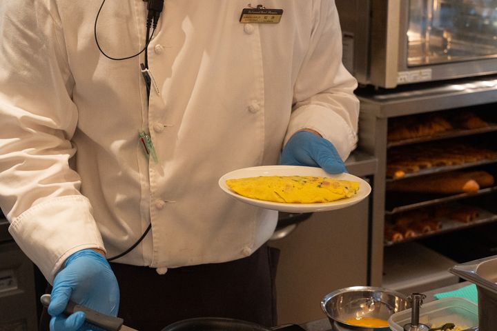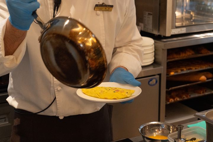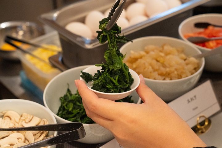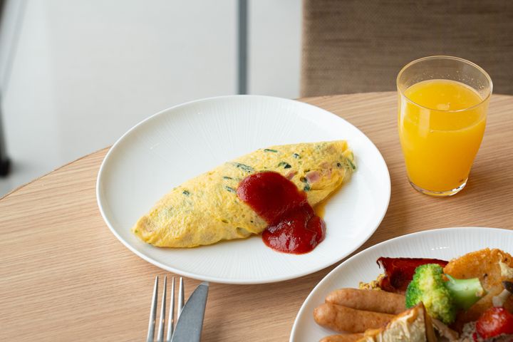 朝食ビュッフェに設置されたライブキッチンでは、その場で焼き上げてもらえるオムレツが目玉の一つ。5種類の具材から好きなものを選び、小皿に入れてスタッフに渡すと、目の前でフワッとオムレツを仕上げてくれます。