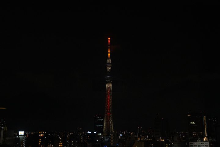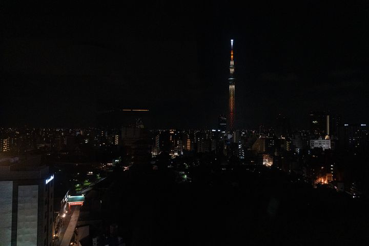 日が暮れて明かりが灯りはじめると、お部屋の窓の外に広がる景色がぐっとドラマチックに変わります。真正面にそびえる東京スカイツリーが、時間とともに色を変えながらライトアップされ、その光が静かに夜空を照らす様子は、まさに“浅草の夜”を象徴するような美しさでした。
