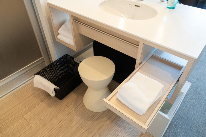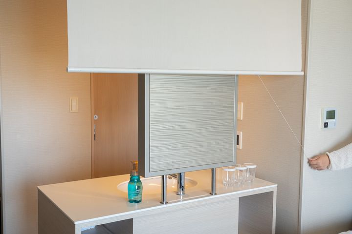 洗面スペースはお部屋の中にありつつ、ロールカーテン式の仕切りで目隠しできる仕様になっていました。使うときだけ開けて、使わないときはサッと隠せるこのスタイル、開放感とプライバシーのちょうどいいバランスで個人的にはかなりお気に入りです。