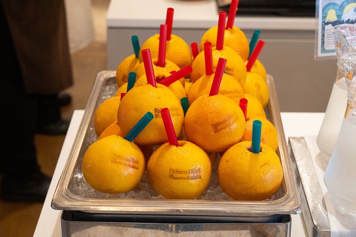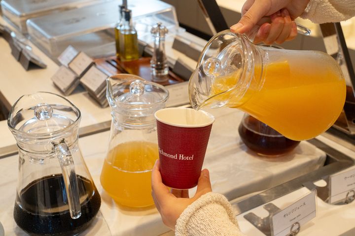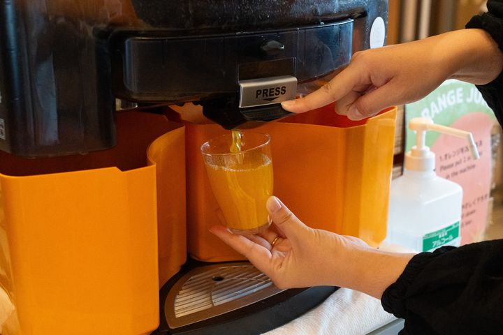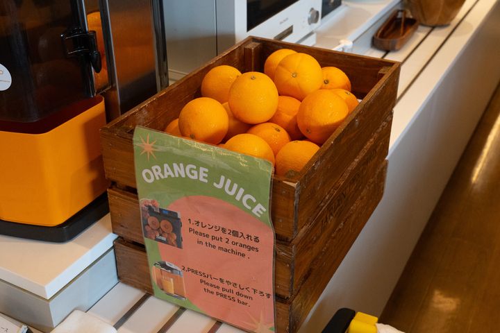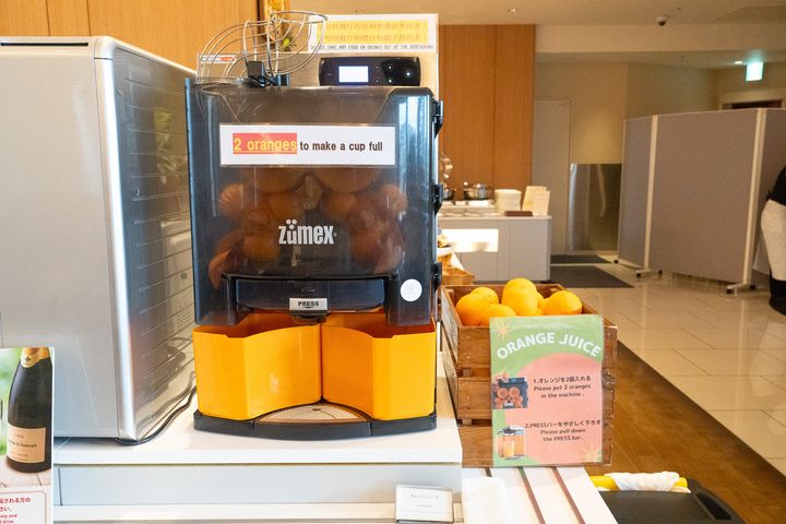 オレンジをジューサーに投入してジュースを作る「生搾りオレンジジュース」のマシンもありました。自分で果実を入れてボタンを押すとジュースがグラスに注がれ、そのまま注ぎたてをいただけます。