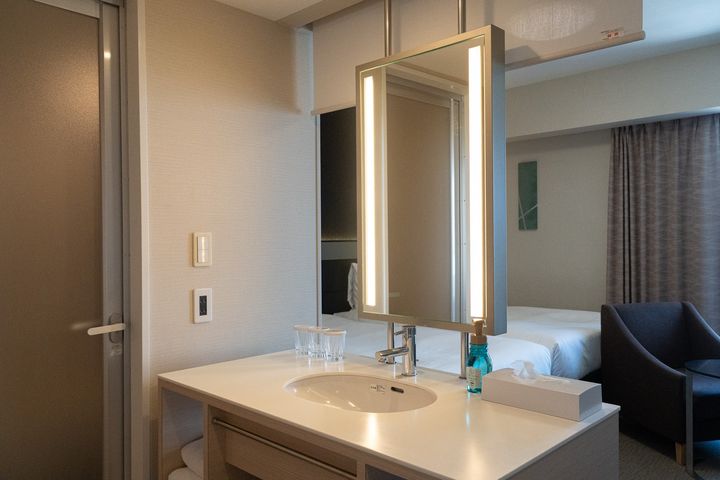 洗面スペースはゆったりとしていて、カウンターも広々。メイクポーチやスキンケアアイテムを広げても十分なスペースがあり、大きな鏡と明るい照明で身支度も快適でした。