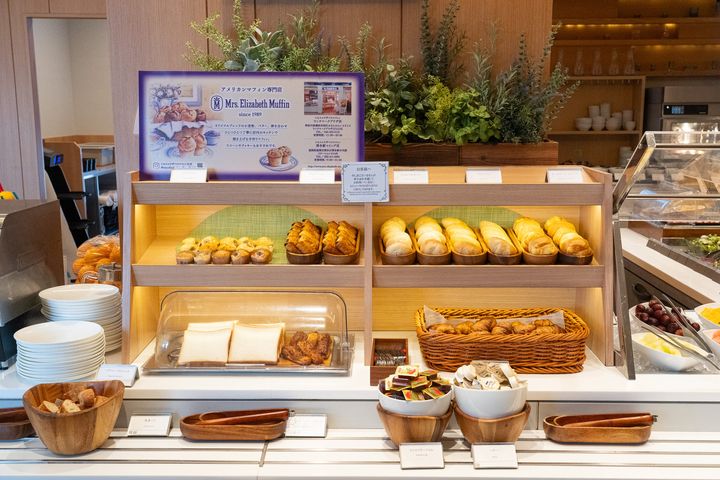 ビュッフェのパンコーナーには、焼き立てパンやマフィンが並んでいて、質にこだわった品揃えが印象的でした。特に、「ミセス・エリザベスのマフィン」は絶対に見逃せません。しっとりと重すぎない生地に、ほんのり香るバナナの甘みが優しく、朝のコーヒーとの相性も抜群です!