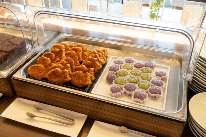 お料理をひと通り楽しんだあと、最後に立ち寄りたくなるのがスイーツコーナー。スイートポテトやたい焼き、ガトーショコラ、わらび餅といった、ひとつひとつがしっかり丁寧に仕上げられたスイーツたち。