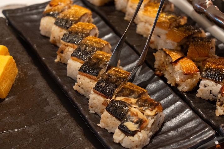 ビュッフェの一角には、少し意外なメニューとして押し寿司も並んでいました。浅草という土地柄を感じさせる、和のアクセントとしてとても印象的な存在の"押し寿司"です。