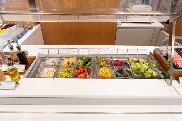 サラダ&フルーツコーナーは、見た目の彩りも美しく、ひとつひとつが新鮮でシャキッとしているのが印象的でした。サラダは野菜の種類が豊富で、ドレッシングも数種類から選べるスタイルです。どの野菜も水分をたっぷり含んでいて、シャキシャキとした食感。前日までの疲れや重たさをリセットしてくれるような、体が喜ぶ味わいでした。