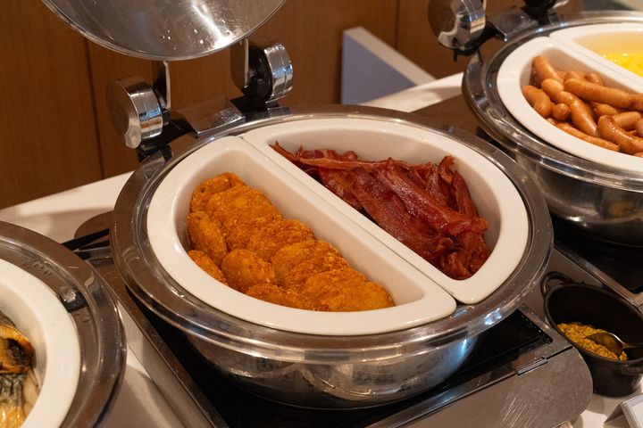 温製メニューの並ぶコーナーも、種類豊富。この日は、シュウマイやベーコン、ハッシュドポテト、焼き鯖、スクランブルエッグなどが並び、どれも出来たてに近い状態で提供されていました。