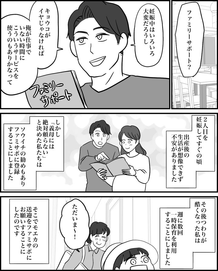 私はキョウコ(30歳)。夫のソウイチ(35歳)と娘のモエカ(2歳)、そして生後1ヶ月の息子ハルキとの4人家族です。近所に住む義母(ミズエ)の干渉がはじまったのは、モエカを妊娠してからのこと。新型コロナウイルスやインフルエンザに罹っているのに構わずやってきたり、1歳に満たないモエカにようかんを食べさせようとしたり……。私たち夫婦は絶対に義母を頼らないと決めました。やがてソウイチからはファミリーサポートの利用を提案され……。