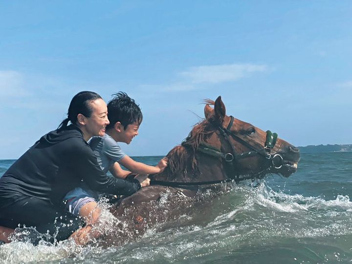 息子が9歳と12歳の時に三浦海岸で海の中を馬と遊ぶ海乗馬体験をしました。昔、乗馬を習っていた私は体が覚えており、二人乗りで走れた時は少しだけ息子に尊敬されました。息子も最初は怖がっていたのですが、最後には一人で海を駈け足することもできました。この時のお馬さんが忘れられず、3年ぶりに再会!12歳にもなると一人で問題なく乗りこなしており、大きな成長を感じました。(髙橋くみさん 50歳・ベアジャパン代表取締役、息子12歳)