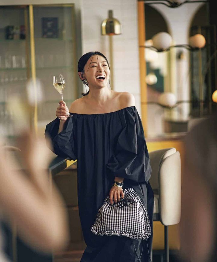 ワンピース¥53,900(ヴェニット/ハルミ ショールーム)バッグ¥322,300(トッズ/トッズ・ジャパン)パンプス¥69,300(ネブローニ)ピアス¥35,200ブレスレット¥35,200(ともにブランイリス/ブランイリス トーキョー)ダブルフィンガーリング¥18,260(バルブス/ズットホリック)