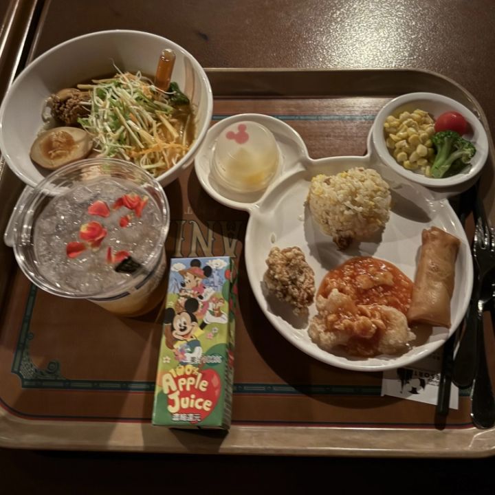 夕食は火山の内部にある中華レストラン「ヴォルケイニア・レストラン」で。私が選んだ夏季限定の冷やし担担麺は、エビだれのスープに肉みそ、海鮮、野菜がたっぷり。別添えラー油で辛さを調整でき、さっぱりしながらも食べ応え十分でした。息子のお子様セットは、チャーハン、唐揚げ、エビチリ、春巻きにゼリーとジュース付き。彩りも良く、食べやすい味付けでペロリと完食。冷房の効いた店内でゆっくり休憩できたのもうれしい時間でした。