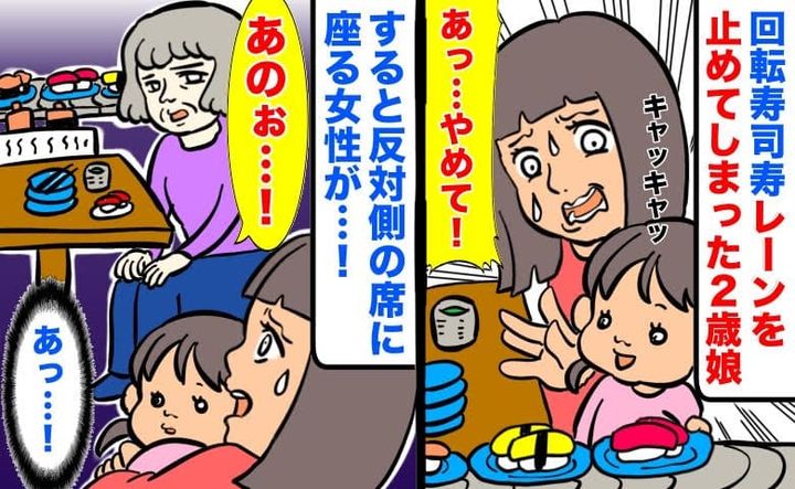 3. 「あっ…やめて!」回転寿司のレーンを止めてしまった2歳娘。ヤバい…!すると反対側の席に座る女性が…!