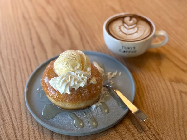 カフェラテは丁寧にアートが描かれており、とても美しい。コクがあるコーヒーベースなので甘いドーナツとよく合い、バランスが絶妙でした。