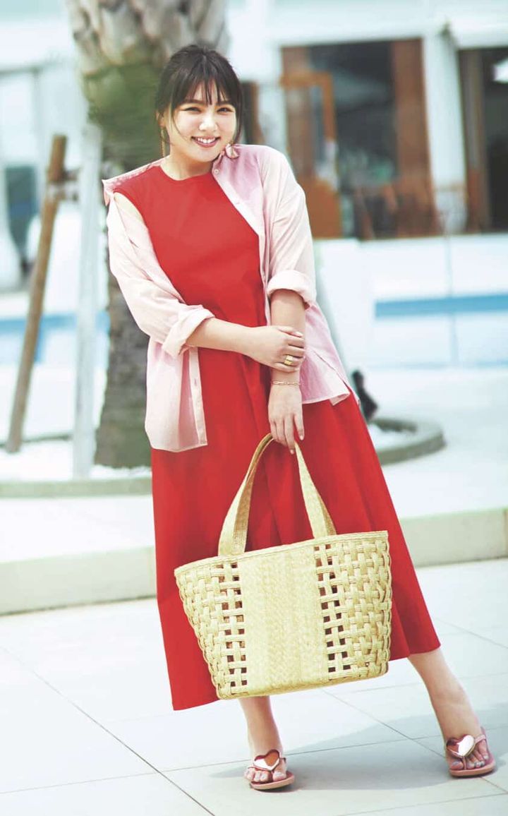 シャツ¥3,960[撥水](クロス ファンクション)ワンピース[接触冷感・抗菌防臭・消臭]¥15,400(ドレステリア)バッグ¥68,200(ラドロー/ラドローオンラインストア)サンダル¥3,300(イパネマ/シードコーポレーション)ピアス¥173,800〈ココシュニック〉ブレスレット¥8,800〈ココシュニック オンキッチュ〉(ともにココシュニック)リング¥13,200(ワンエーアールバイウノアエレ/ウノアエレ ジャパン)