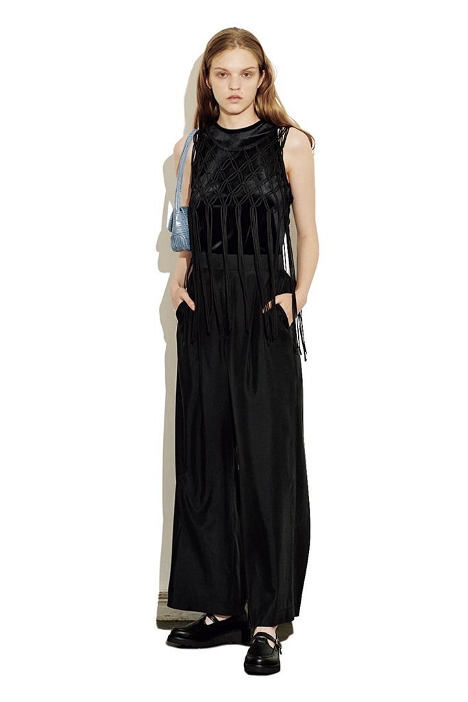 中厚手のポリエステル素材は、脚線にまとわりつかず流れのいいシルエットを形成。タックが生むドレープもなめらかな素材と相まって穿き姿に抑揚を創出。ALL黒のストイックさをほぐすフリンジ風デザインや動きのあるマクラメ編みのニットタンクが、全部黒の重厚感を払拭。
