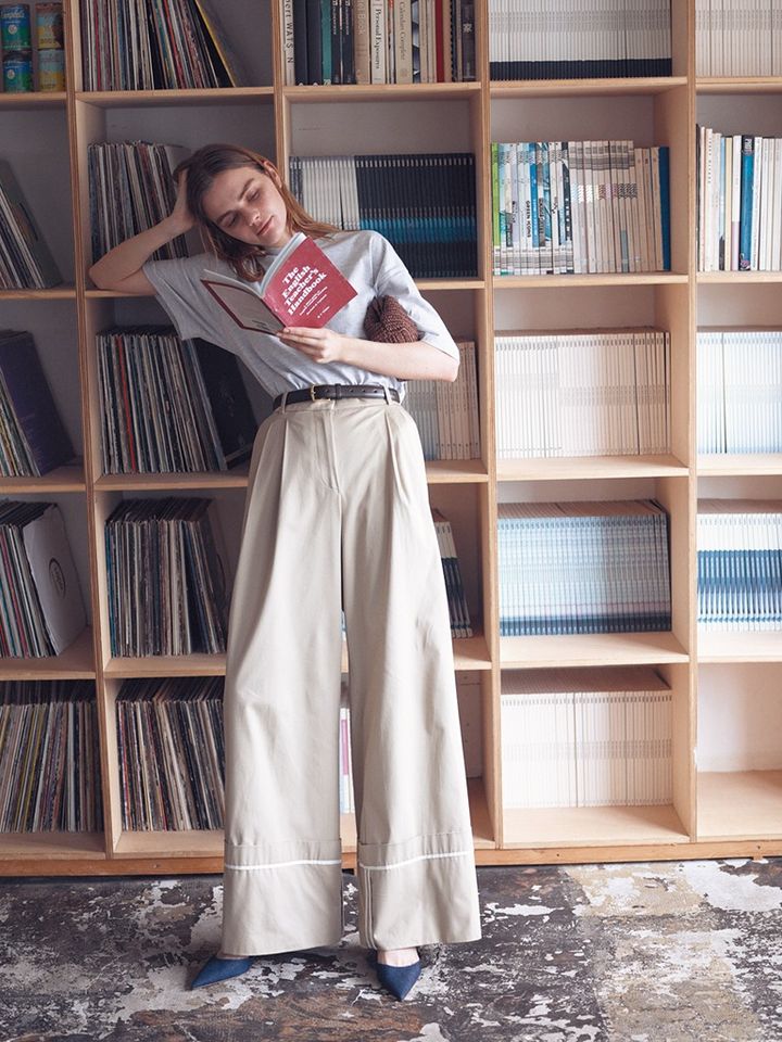 目を引くロールアップがほどよい飾りに。ウエストはきゅっと、すそは広がるAライン。チノの生地感でドレープの効いた風合いだから、キレイな装いにも向く。メンズがよくやりそうな装いも全部ルーズに仕上げるとやぼったくも見えかねないから、足元にはパンプス、ウエストにはベルトを足す趣向を凝らして、品のよさも維持。