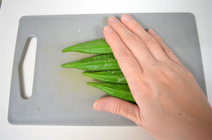 オクラはヘタとがくを落とし、塩で板ずりしましょう。