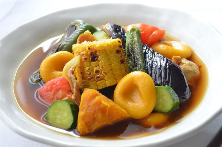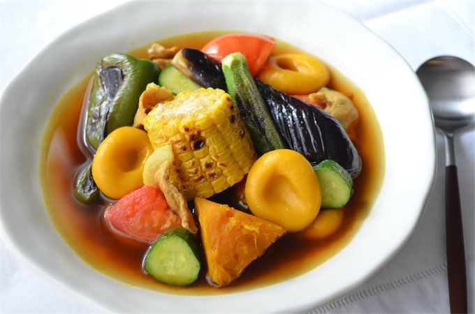 すると、トマトの甘酸っぱさにきゅうりのポリポリ食感、カボチャだんごの甘味と豚肉の旨味が混ざり合って、唸るほどのおいしさに!スパイシーだけど和風なスープとよく合います。