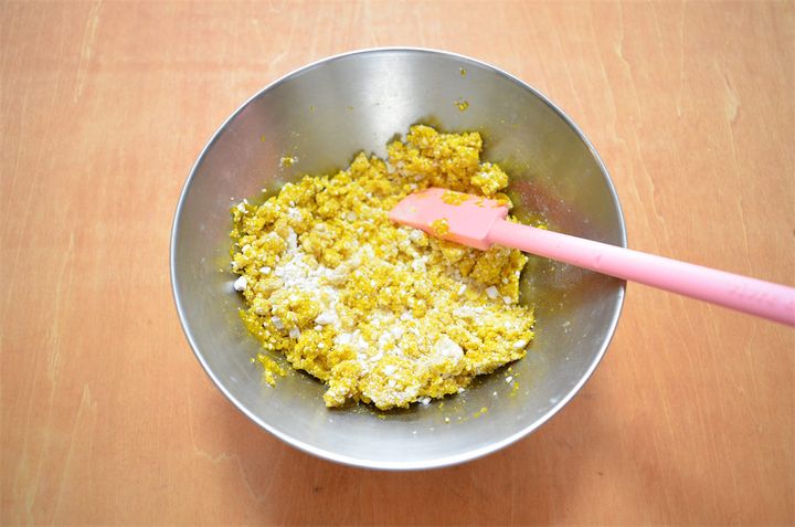 4. 白玉粉を合わせて水を少しずつ入れ、耳たぶ位の軟らかさにする。だんごを丸めて真ん中を少しへこませて、たっぷりの沸騰した湯(分量外)で茹でる。