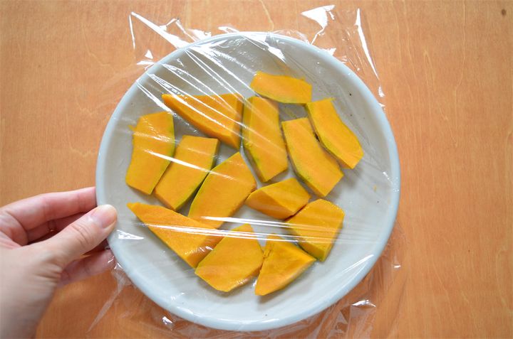 3. [カボチャだんご]を作る。かぼちゃは皮を剥いて薄切りにし、耐熱皿に入れてラップをする。600Wの電子レンジで3分ほど加熱して、軟らかくなったら裏ごしをする。