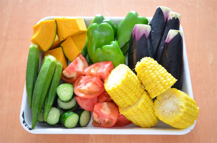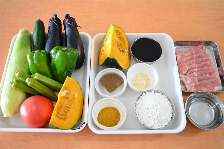 1. かぼちゃは種を取り一口大に切り、きゅうりは1cm厚さの輪切りにする。トマトは一口大、ピーマンとなすは縦半分に切る。とうもろこしは4等分に切り、豚肉は3cm幅に切る。オクラは板ずりする。