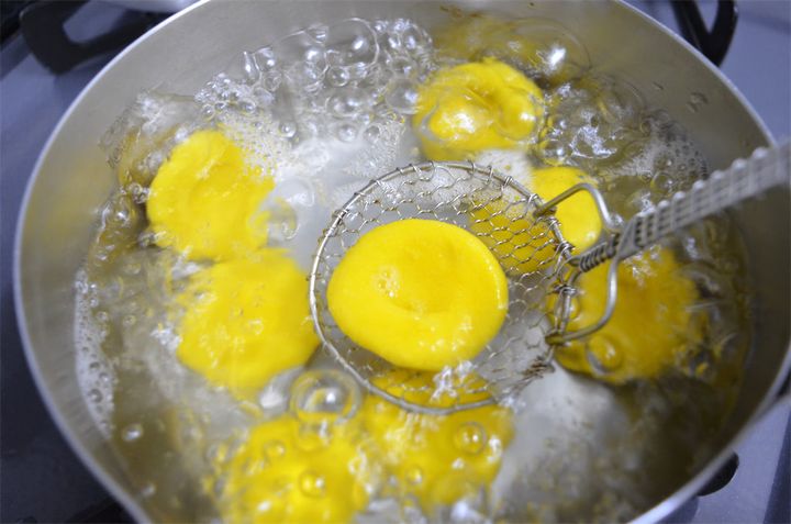 浮き上がってきたら冷水の入ったボウルに入れ、ザルに取って水気を切りましょう。