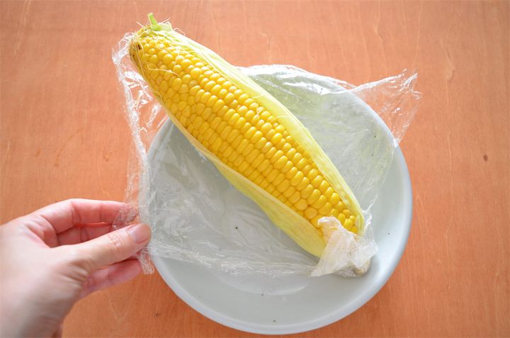 とうもろこしは生のままでもいいですが、皮を半分剥き水にさらしてラップで包み、600Wの電子レンジで3分ほど加熱しました。こうすることで、焼いたときに火の通りが均一になるそう。